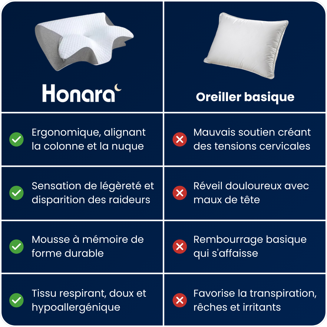 L'oreiller Honara élimine les "micro-réveils" causés par l'inconfort. En soutenant précisément votre nuque, il évite les torsions musculaires, libère vos voies respiratoires et absorbe les points de pression, vous permettant de plonger dans un sommeil profond et réparateur.