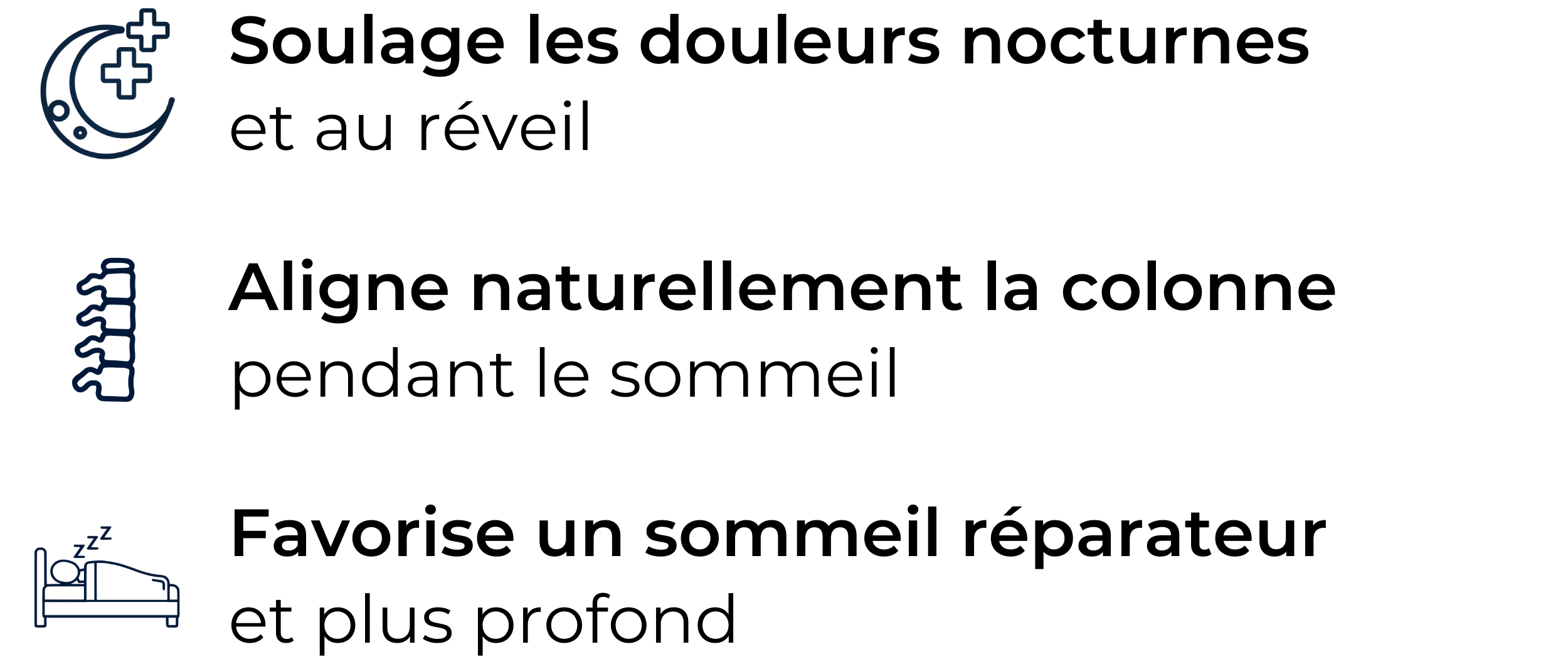 "Depuis que je l'utilise, plus de douleurs en me levant le matin, je le recommande pour les personnes qui dorment sur le côté." - Patricia D.